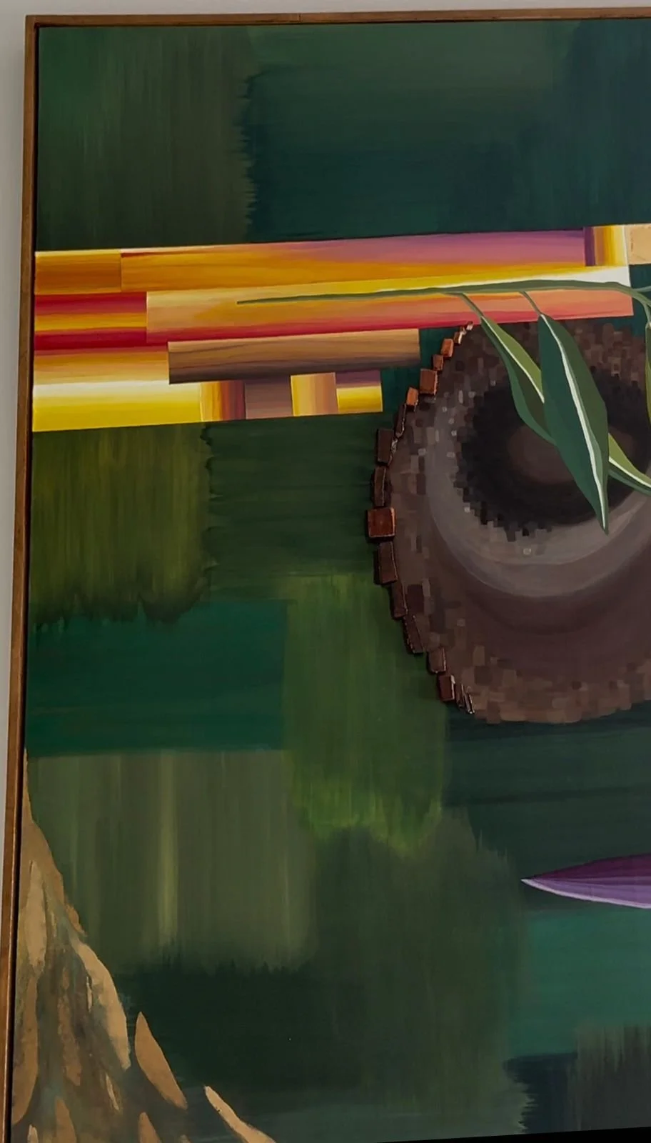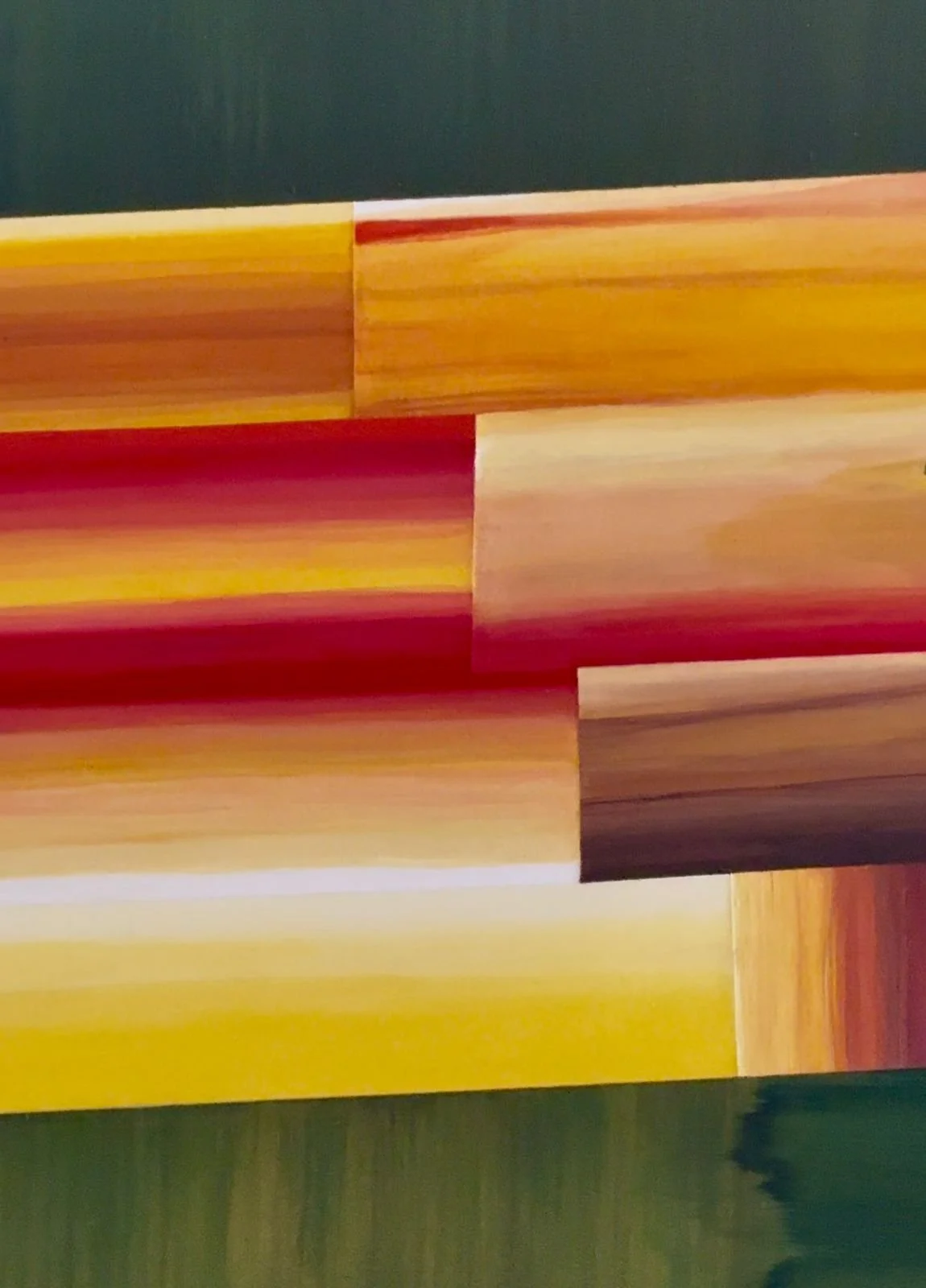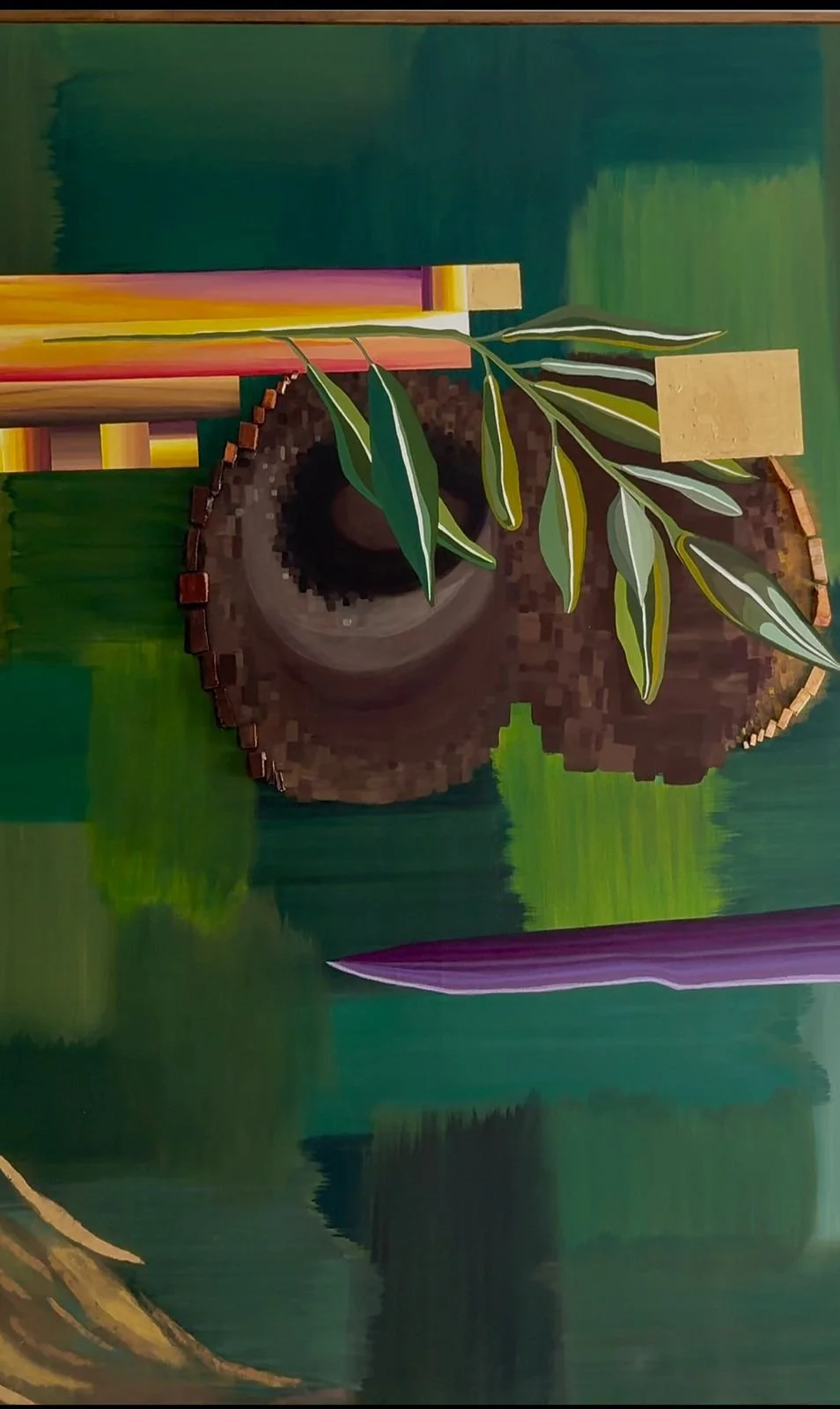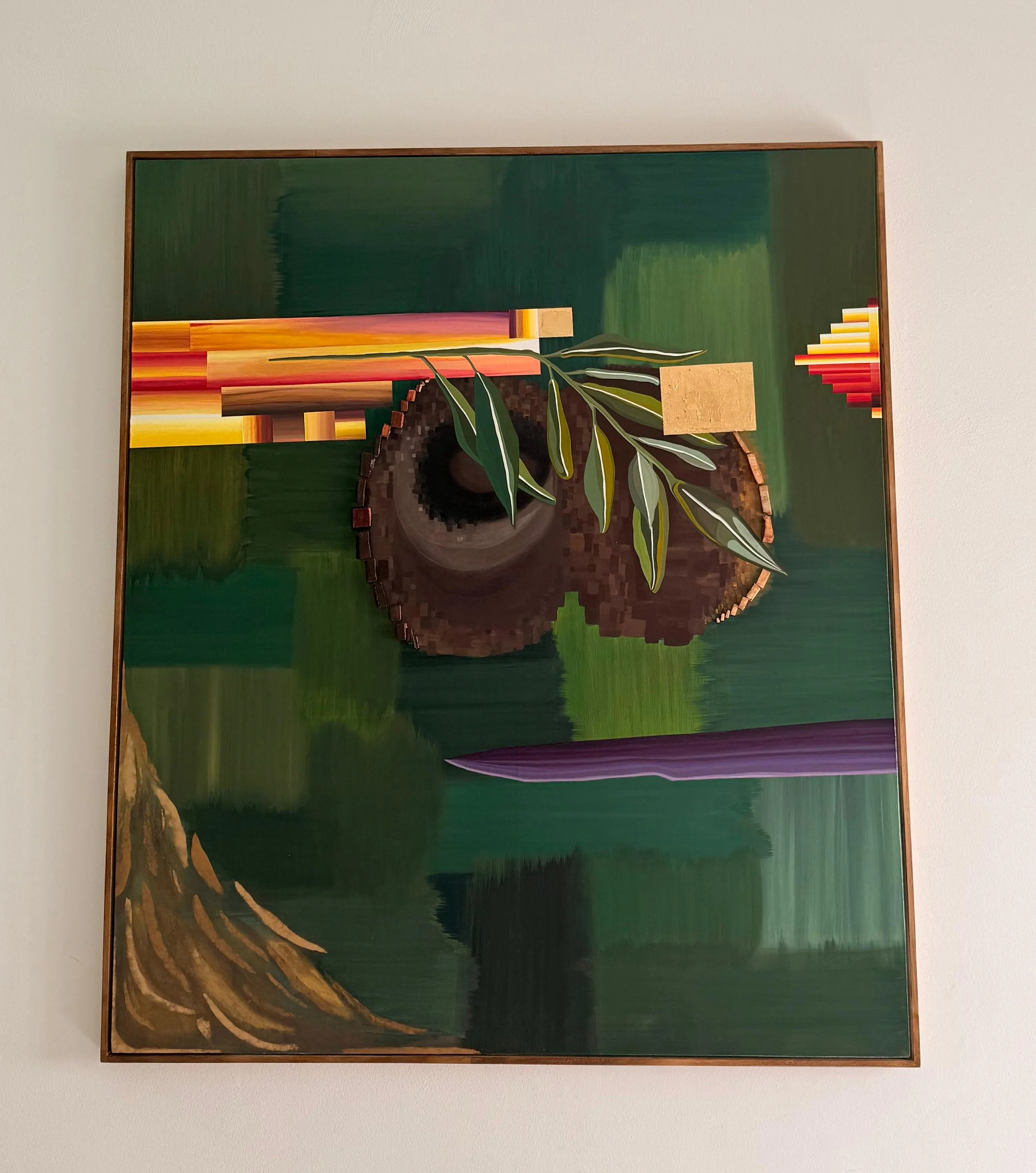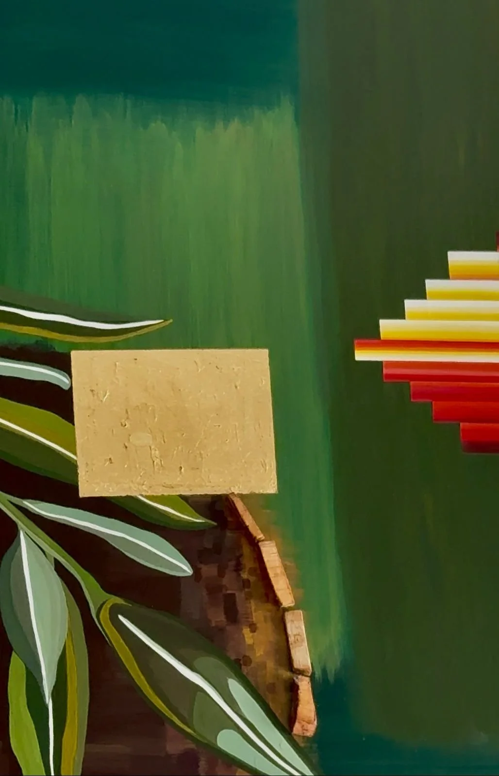 En esta obra, la artista explora la profundidad de la materia y la luz a través del contraste entre el verde y los reflejos dorados. El relieve en madera genera un ritmo visual orgánico, mientras el pan de oro aporta un destello de energía contenida.
