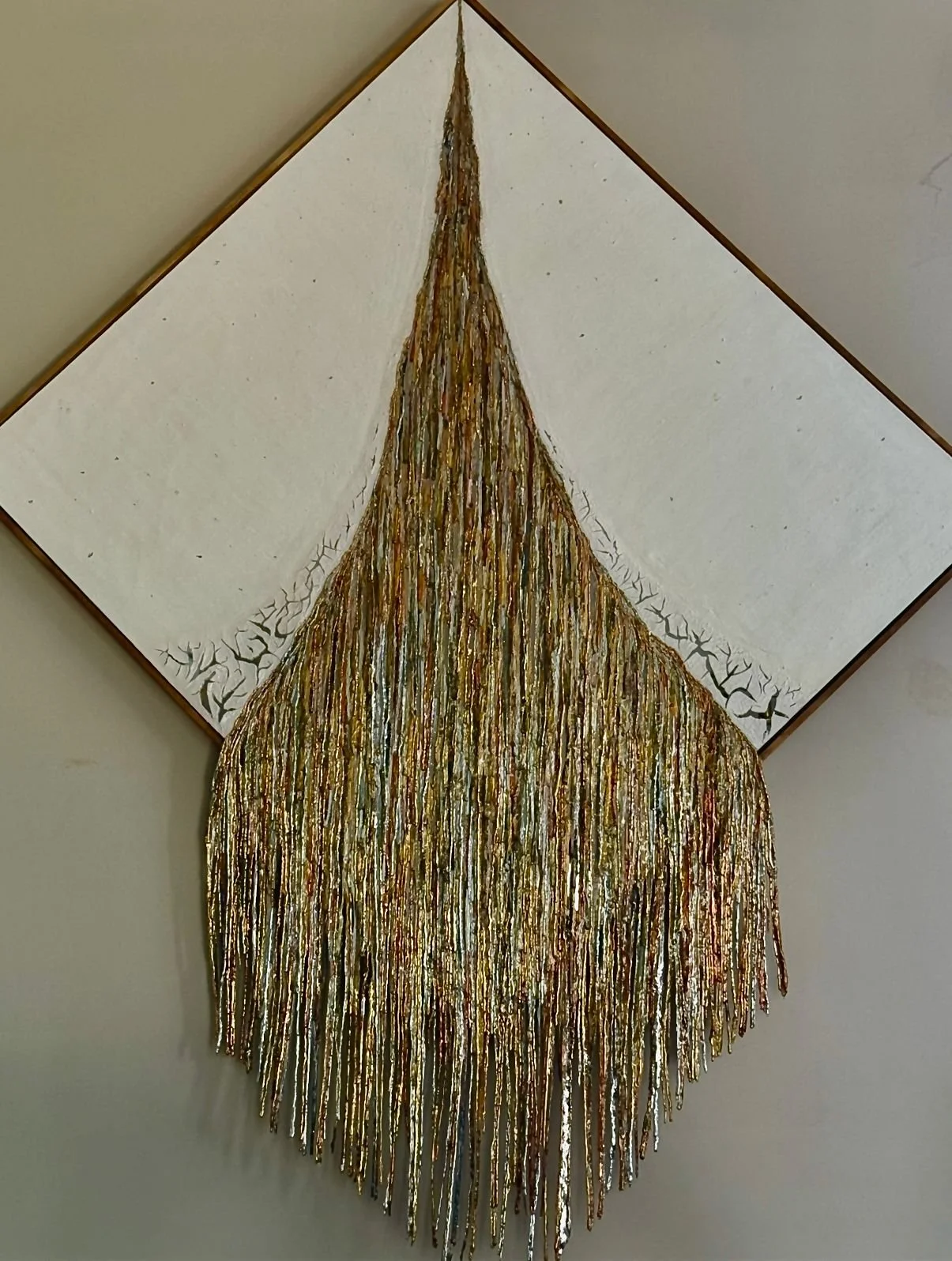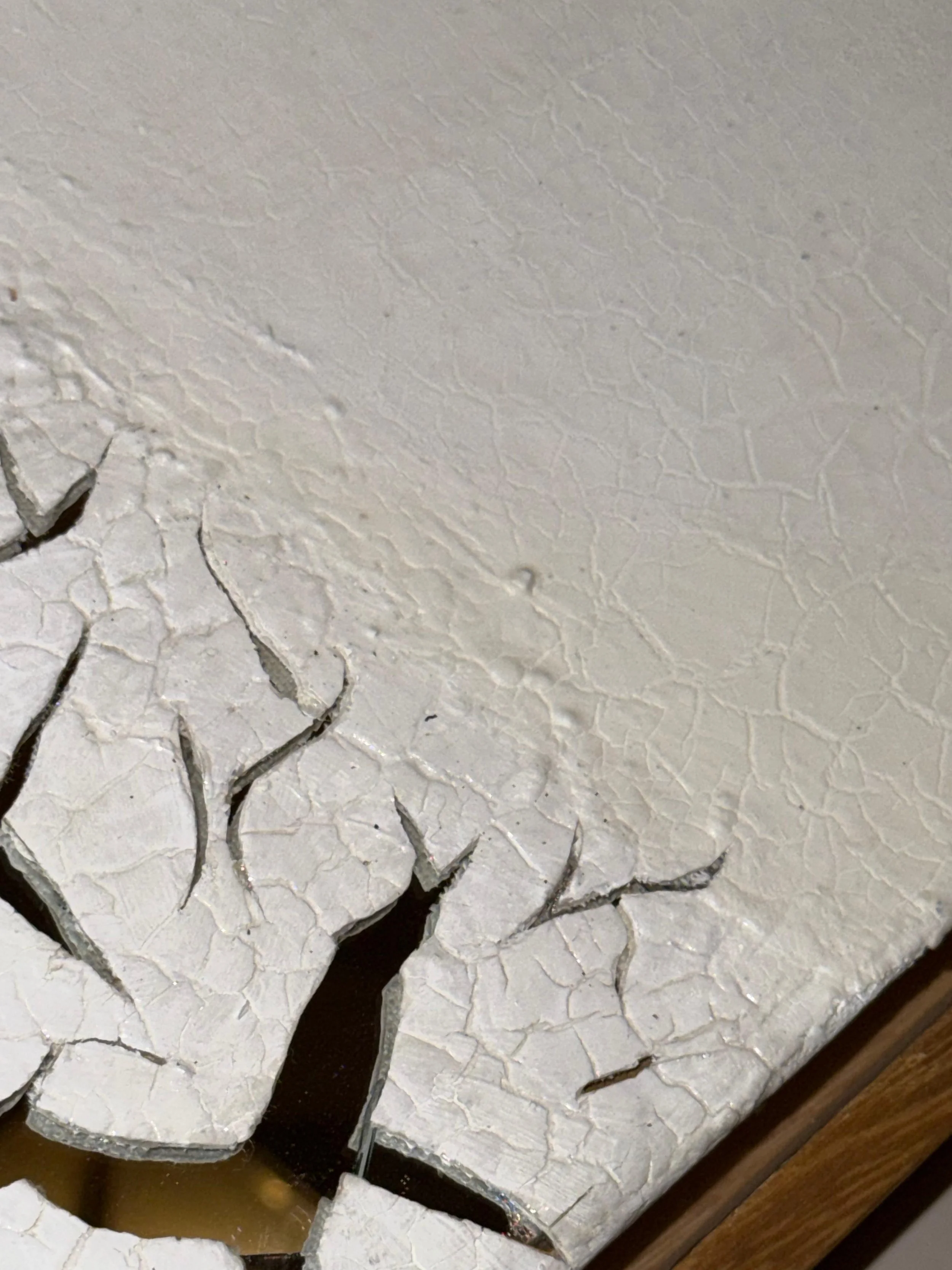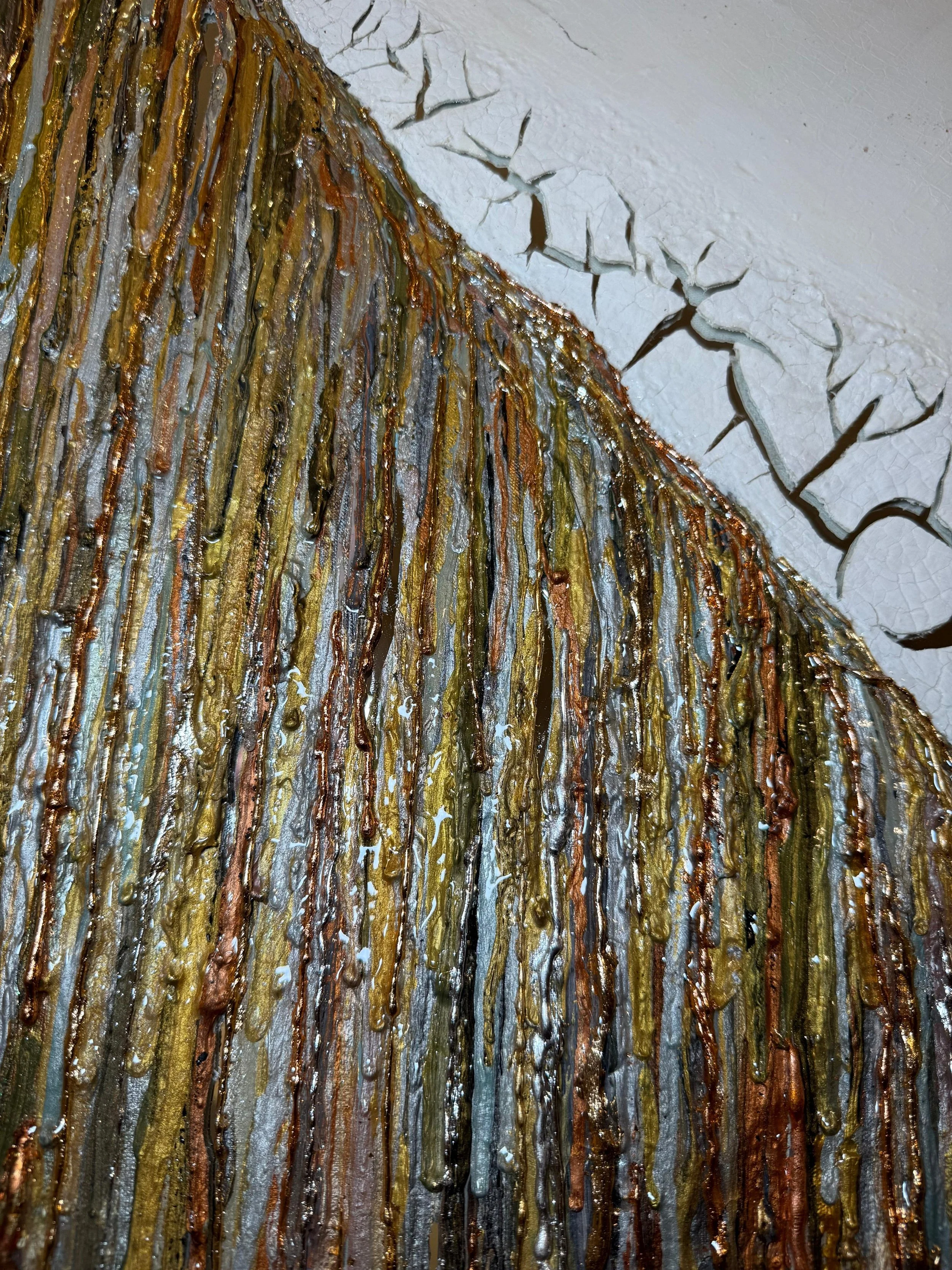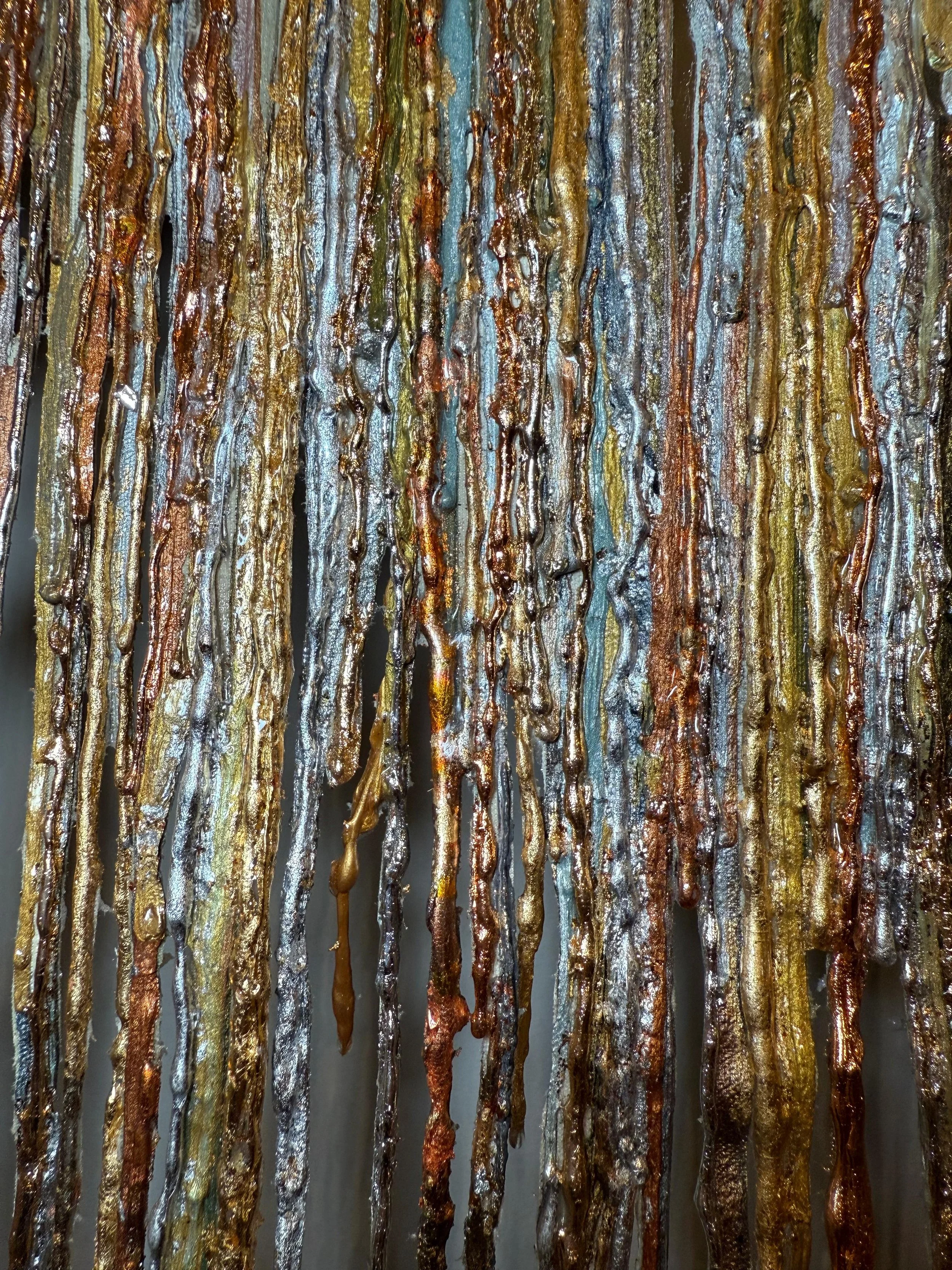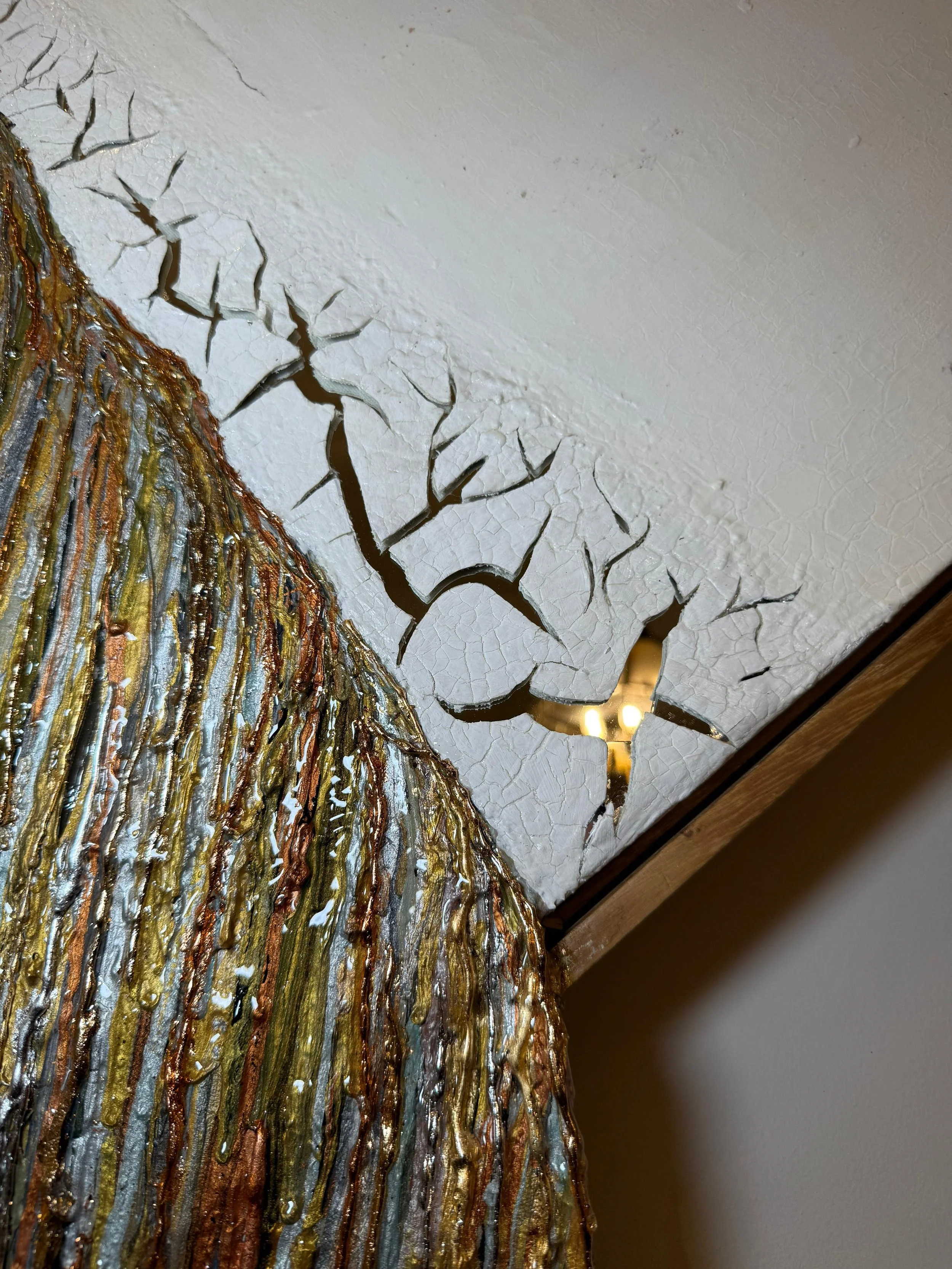 Capas de acrílico y resina, intervenidas con hojas metálicas de oro, plata y bronce, se despliegan sobre una estructura de madera en relieve. Entre las fisuras, espejos ocultos multiplican destellos y fragmentos del entorno. El exceso de materia deja cráteres, brillos y bordes que evocan procesos geológicos; la lectura cambia con la luz y el desplazamiento del espectador.