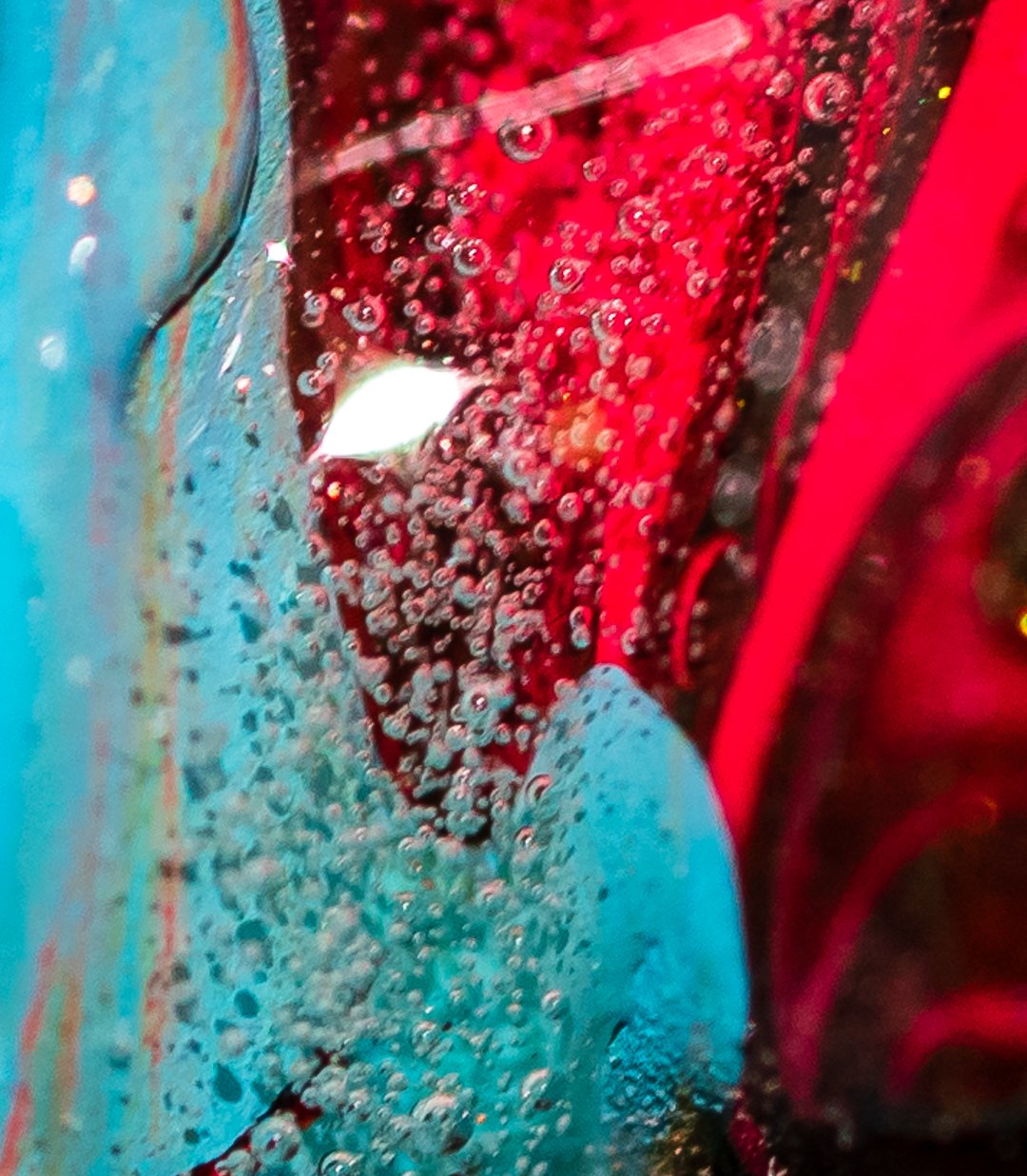 La obra nace de capas de acrílico que, al ser encapsuladas en resina, conservan su brillo y profundidad. Una estructura de madera sostiene y separa el cuerpo de la pieza del muro, permitiendo que el relieve se desprenda del plano y habite el espacio. La materia desciende en tiras irregulares —entre cascada y corteza— donde color, densidad y bordes quebrados conviven en tensión. La luz activa la superficie, resalta las distintas capas y hace que cada desplazamiento del espectador modifique la lectura. No es solo pintura: es un fragmento de paisaje suspendido en pleno derrame.