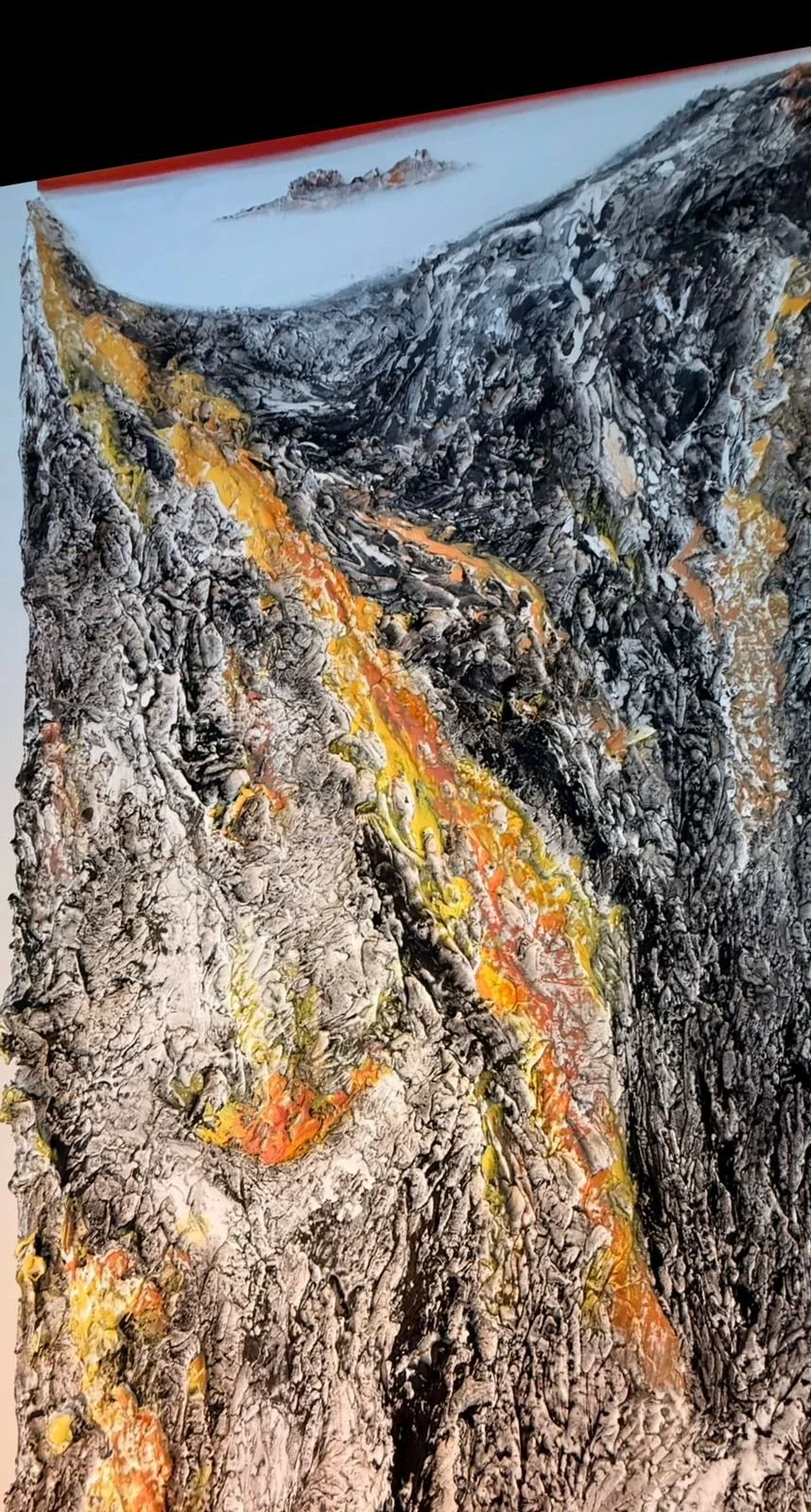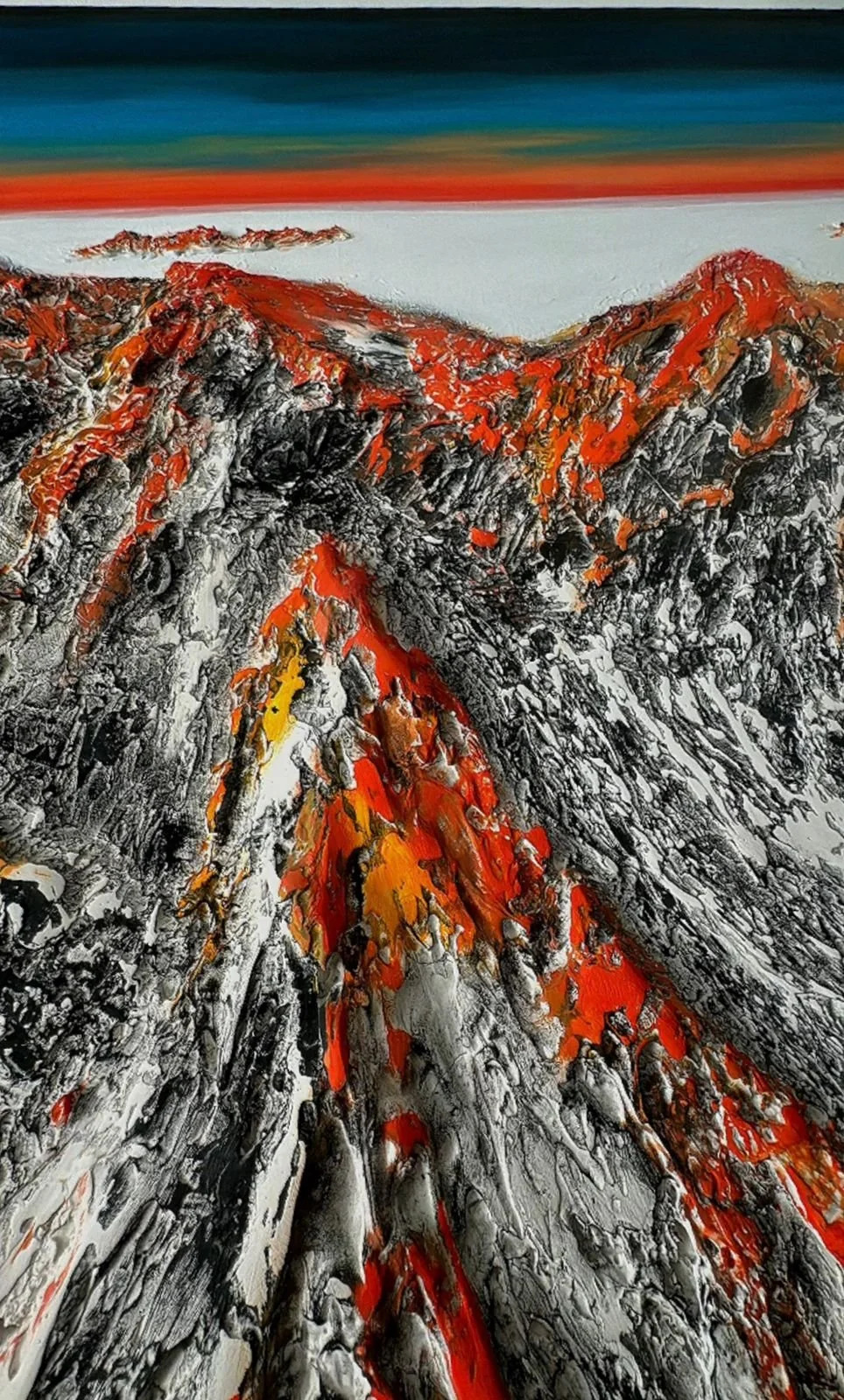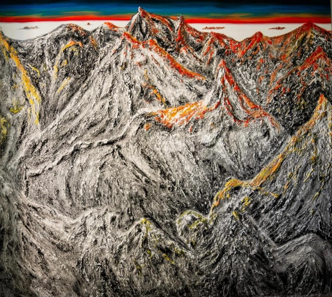 En esta obra imponente, Evelyn Orozco transforma materiales constructivos en una topografía emocional. El relieve y la textura evocan la fuerza de la naturaleza y la feminidad, mientras formas de mujeres se insinúan entre las montañas, revelándose y ocultándose a la vez. La pieza conjuga materia y espíritu, convirtiendo el paisaje en cuerpo y el cuerpo en paisaje.